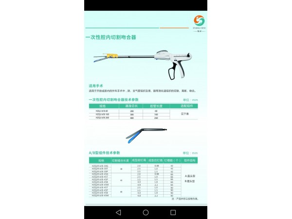 產品說明:主要用于腹部外科、婦科、兒科和胸外科內視鏡手術中組織的橫斷、切割和吻合。也可用于肝實質、膽血管和膽囊實質的橫斷和切除吻合