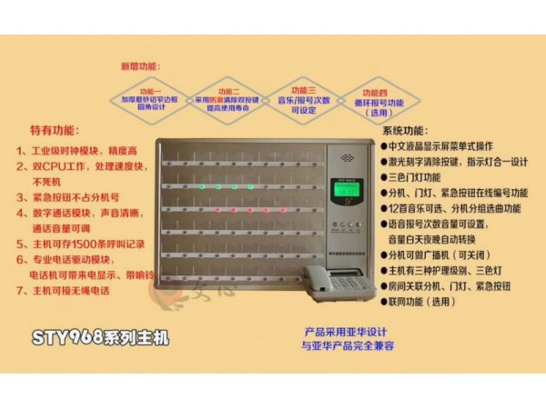 產(chǎn)品說明:1.多分機(jī)同時呼叫無遺漏。通話時其它分機(jī)的呼叫仍有效,零誤呼叫 2.可接多個病床分機(jī)和廁所分機(jī)(且可同時受理10個病床分機(jī)呼叫) 3.主機(jī)顯示呼叫床號并且語音報號,也...