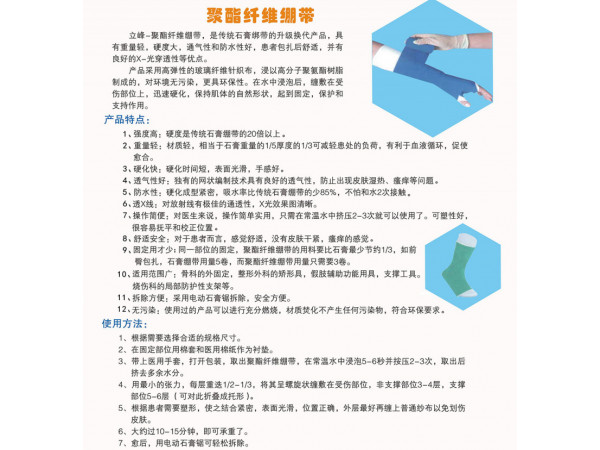 產(chǎn)品說(shuō)明:立峰生物聚酯纖維繃帶采用高彈性的玻璃纖維針織布,浸以高分子聚氨酯樹(shù)脂制成的,對(duì)環(huán)境無(wú)污染,更具環(huán)保性。在水中浸泡后,纏敷