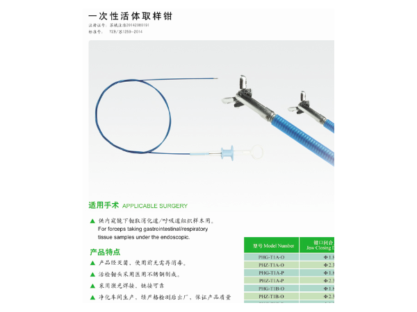 產(chǎn)品說明:一次性使用活檢鉗:產(chǎn)品注冊證:浙食藥監(jiān)械(準)字2014第2220762號(更)一次性胃鏡活檢鉗:Φ2.3×1600mm一次性腸鏡活檢鉗:Φ2.3×