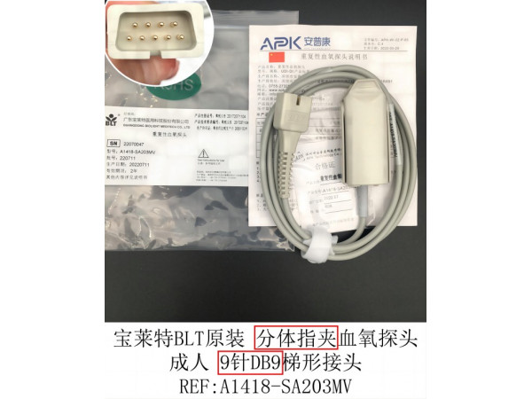 產(chǎn)品說(shuō)明:寶萊特BLT原裝 分體成人指夾血氧探頭加密 9針DB9梯形 A/Q系列監(jiān)護(hù)儀/新M8000/M9000/M9500/M7000/M1000 接頭白色線 REF:A1418-SA2