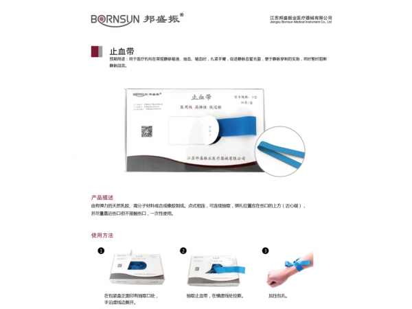 產(chǎn)品說(shuō)明:本品適用于醫(yī)療機(jī)構(gòu)在常規(guī)治療及救治中手臂靜脈注射、靜脈輸液或抽血時(shí)扎緊手臂,暫時(shí)阻斷靜脈回流時(shí)使用?;蛑w出血、野外蛇蟲(chóng)