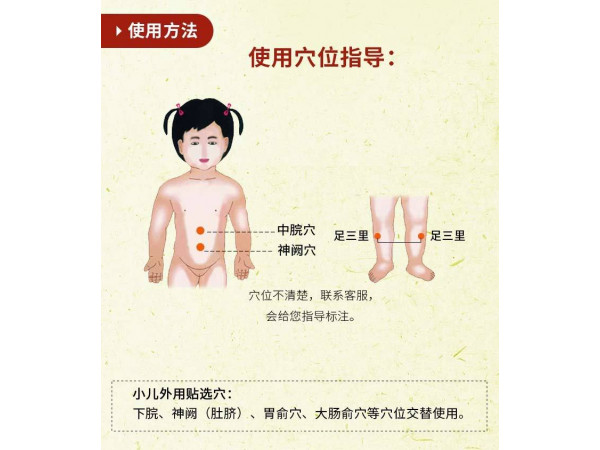 產(chǎn)品說明:沿缺口撕開包裝袋,取出貼劑,揭開透明膠膜,貼于穴位,清潔相應(yīng)穴位,打開包裝,取出小兒貼,將貼劑的隔離膜撕去,以對準(zhǔn)相應(yīng)穴