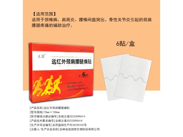 產(chǎn)品說明:適用于頸椎病、肩周炎、腰椎間盤突出癥、膝骨關(guān)節(jié)炎、網(wǎng)球肘、腰肌筋膜炎、肌肉勞損和軟組織損傷所致疼痛的貼敷治療。