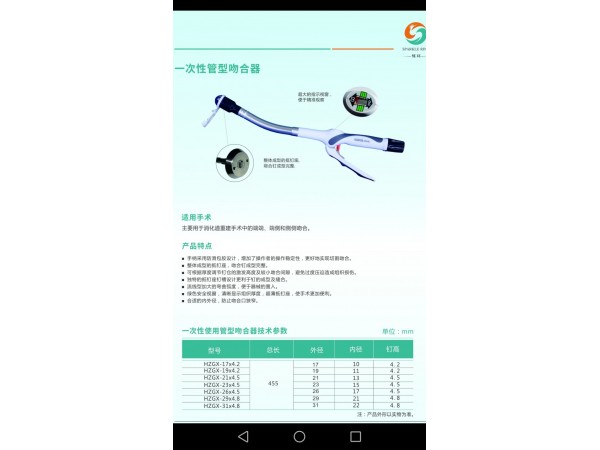 產(chǎn)品說(shuō)明:一次性管形吻合器主要用于食道,胃,十二指腸,小腸等消化道的端端吻合,端側(cè)吻合等