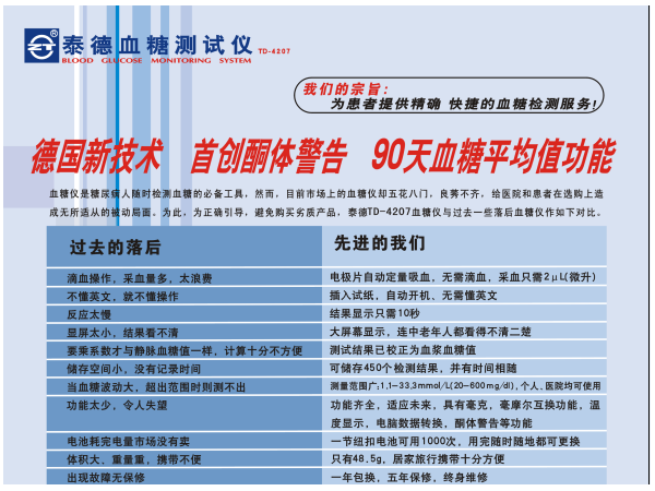 產(chǎn)品說(shuō)明:血糖儀為高端臨床定位產(chǎn)品;產(chǎn)品重復(fù)測(cè)試誤差率低于0.02。以先進(jìn)的生物感應(yīng)技術(shù)為原理,采用全血方式測(cè)試血糖,試紙反應(yīng)區(qū)采用電