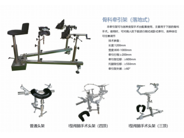 產(chǎn)品說明:本牽引架可與各種類型手術(shù)臺配套使用,主要用于下肢的骨科手術(shù)。使用時,可對病人的下肢進(jìn)行側(cè)式或臥式牽引,各種體位可任意調(diào)節(jié)