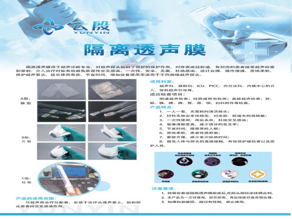 產(chǎn)品說明:隔離透聲膜/超聲隔離透聲膜產(chǎn)品用途:與超聲類治療儀配套使用,安裝于治療頭上,用于防止患者間交叉感染。