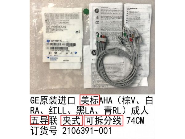 產品說明:GE原裝進口 美標AHA(棕V、白RA、紅LL、黑LA、青RL)成人 五導聯(lián) 夾式 可拆分線 74CM 訂貨號 2106391-001GE監(jiān)護儀型號:B20/30/4