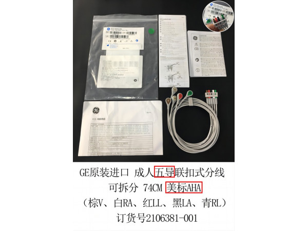 產品說明:GE原裝進口 美標AHA(棕V、白RA、紅LL、黑LA、青RL)成人 五導聯(lián) 扣式 可拆分線 74CM 訂貨號2106381-001 GE監(jiān)護儀型號:B20/30/4