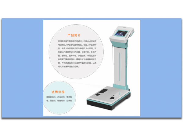 產(chǎn)品說(shuō)明:人體成分分析儀是一種可以幫助人們了解自己身體組成的設(shè)備。采用多頻率生物電阻抗測(cè)試法,利用八點(diǎn)接觸式電極測(cè)試人體各部位生物