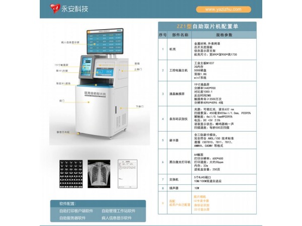 產(chǎn)品說明:自助取片機的功能特點:1. 兼容醫(yī)院所有影像設(shè)備,標準DICOM接口。2. 膠片打印機配置特點:分辨率2400*2400dpi,片盒數(shù)量4*200張
