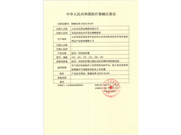產(chǎn)品說明:醫(yī)用一次性防護服廣告批準文號魯械廣審(文)第2020030465號注冊證編號魯械注準20202140108注冊人名稱山東朱氏藥業(yè)集團有限公司注