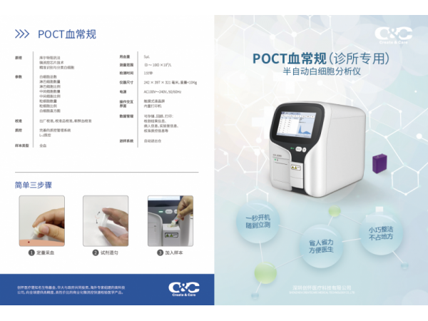 產(chǎn)品說(shuō)明:創(chuàng)懷醫(yī)療微流控技術(shù),專門(mén)針對(duì)98萬(wàn)家基層醫(yī)療機(jī)構(gòu)開(kāi)發(fā)的POCT血常規(guī)產(chǎn)品,也是市場(chǎng)上僅有的一款以金標(biāo)準(zhǔn)方法學(xué)開(kāi)發(fā)的POCT血常規(guī)產(chǎn)