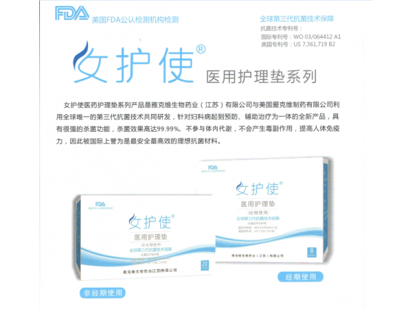 產(chǎn)品說明:針對婦科病起到預防,輔助治療為一體的全新產(chǎn)品,具有很強煩人殺菌功能,殺菌效果高達99.99%。分子組裝抗菌技術是全球領先的第三