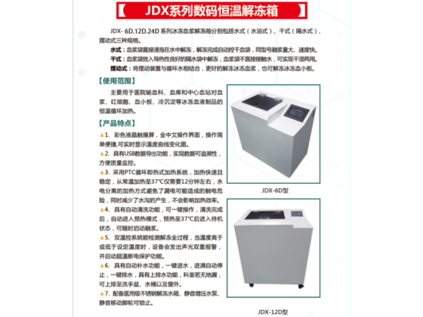 產(chǎn)品說明:一、產(chǎn)品概述1、產(chǎn)品名稱:全溫控循環(huán)血漿解凍箱2、型號(hào)規(guī)格:JDX-6D、JDX-12D、JDX-24D3、編號(hào):4、產(chǎn)品注冊號(hào):5、執(zhí)行標(biāo)準(zhǔn)號(hào)