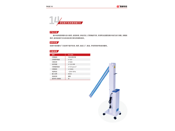 產(chǎn)品說明:紫外線消毒燈車技術(shù)參數(shù)型號ZXC-II電源220V,50Hz材質(zhì)不銹鋼折疊后高度 1070mm燈臂長度 915mm燈管功率30WX2單支燈管紫外線強(qiáng)度