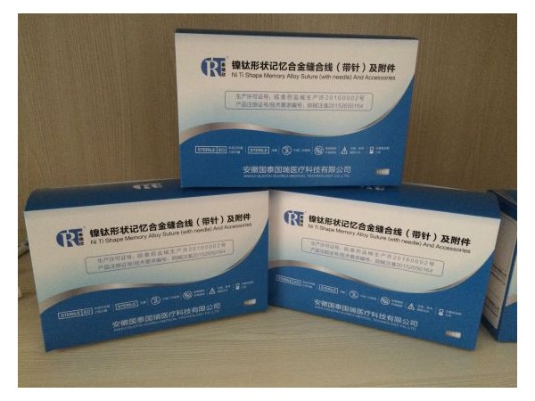 產(chǎn)品說(shuō)明:鎳鈦記憶合金縫合線由縫合針、縫線和夾線扣組成。該產(chǎn)品以無(wú)菌狀態(tài)提供,經(jīng)輻照滅菌,一次性使用。適用于人體軟組織縫合。