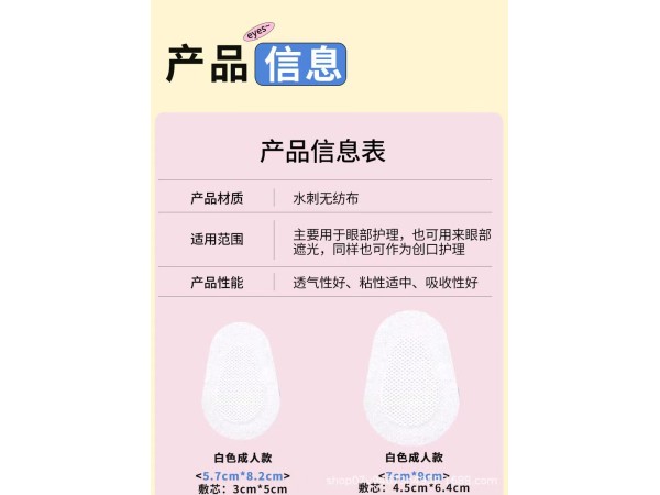 產(chǎn)品說明:貼合眼部輪廓,多圖案,多尺寸,膚色和白色兩種顏色,透氣性好,粘貼適中,吸收性好,遮光效果好,環(huán)氧乙烷滅菌