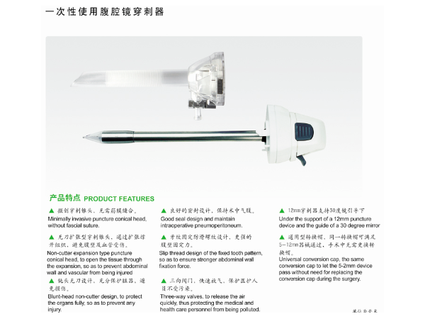 產(chǎn)品說明:微創(chuàng)穿刺錐頭,無需筋膜縫合。無刀擴(kuò)張型穿刺錐頭,通過擴(kuò)張撐開組織,避免腹壁及血管受傷。鈍頭無刀設(shè)計(jì),充分保護(hù)臟器,避免損