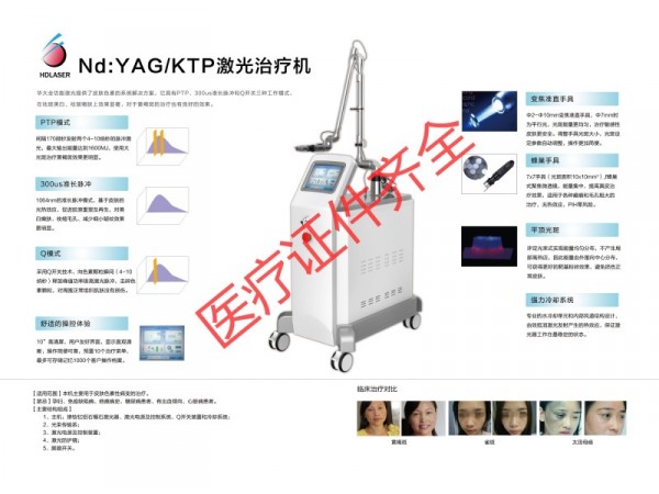 產(chǎn)品說(shuō)明:本機(jī)主要用于皮膚色素性病變的治療(太田痣,顴部褐青色痣,黃褐斑,脂溢性角化病,咖啡斑,雀斑,紋身)。