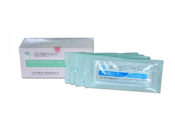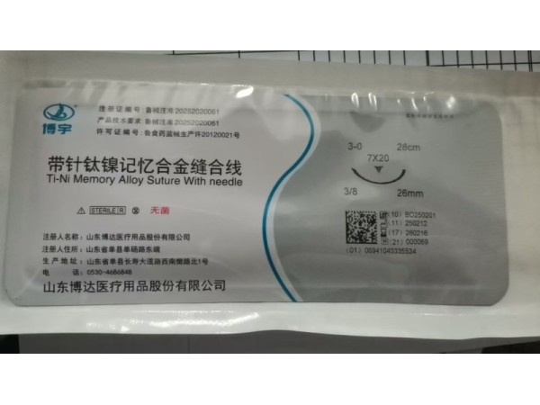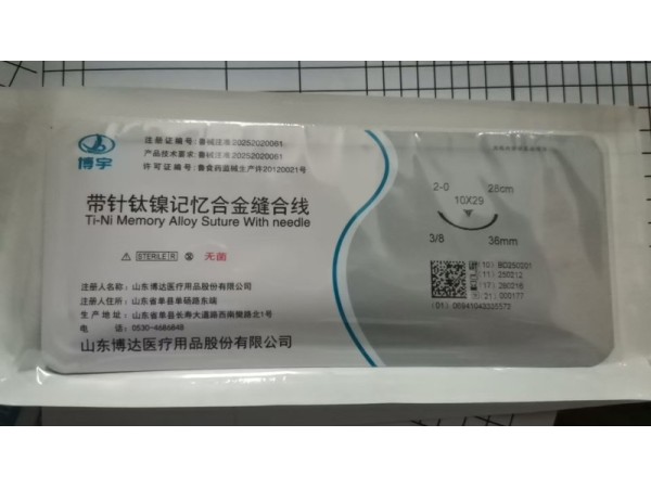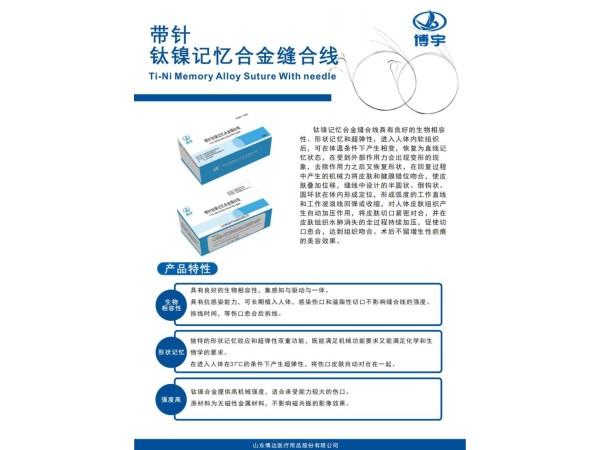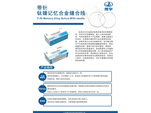 產品說明:鎳鈦記憶合金縫合線由縫合針、縫線和夾線扣組成。該產品以無菌狀態(tài)提供,經輻照滅菌,一次性使用。適用于人體軟組織縫合。