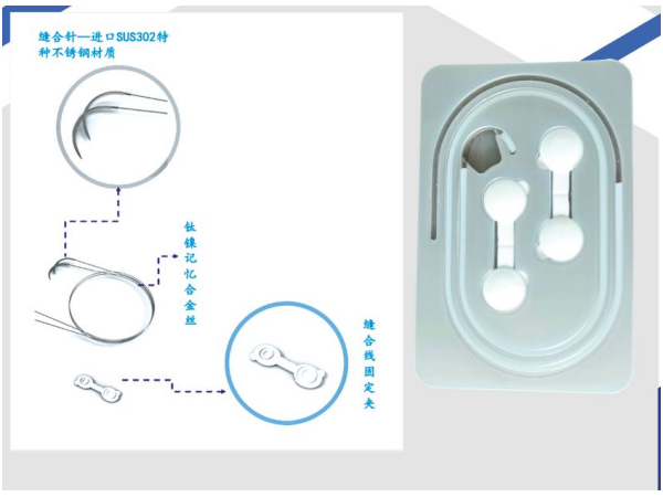 產品說明:材料構成:由鎳鈦記憶合金絲和3/8弧反三角醫(yī)用合針組成,配有產品夾線扣。臨床應用舉例:1)婦產科:剖腹產手術、婦科手術、產科會陰