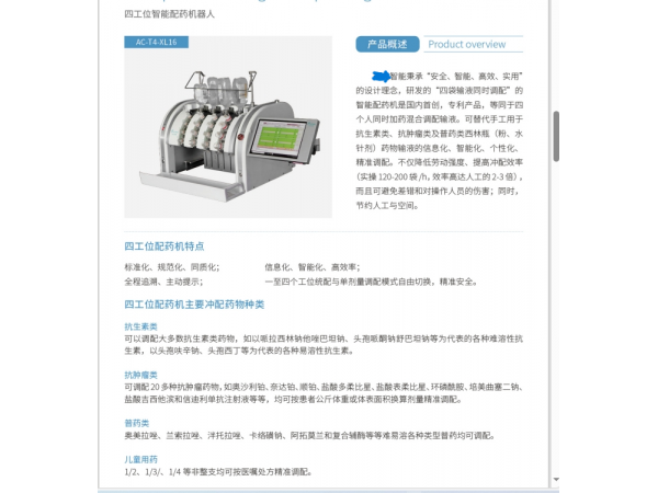 產(chǎn)品說明:臺(tái)潤科技秉承“高效、安全、實(shí)用”的設(shè)計(jì)理念,研發(fā)的“多袋輸液同時(shí)配置”的智能配藥機(jī)是臺(tái)潤科技國內(nèi)**,是國內(nèi)**節(jié)省人工的配