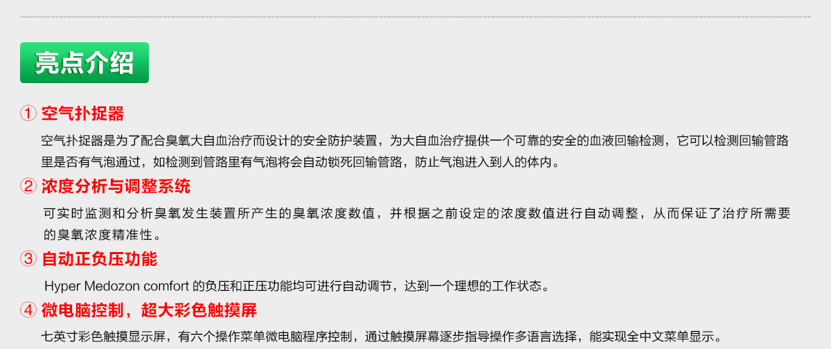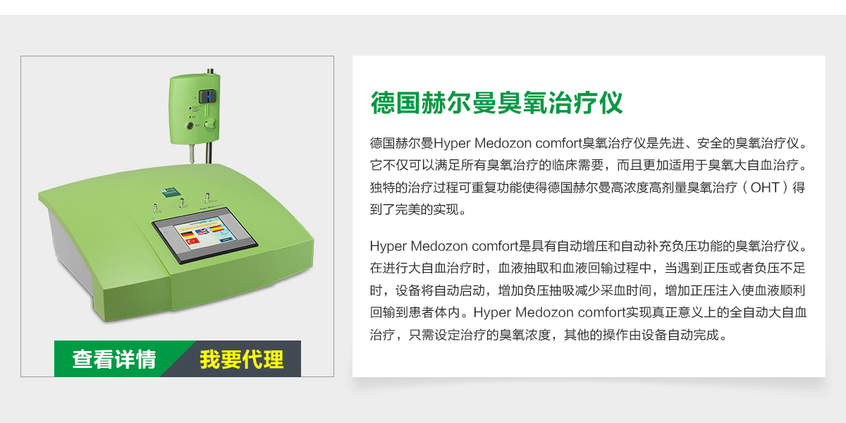 【產(chǎn)品類別】康復(fù)儀【批準(zhǔn)文號】國械注進20153543555【招商區(qū)域】全國【產(chǎn)品賣點】全自動臭氧治療儀 高濃度高劑量【產(chǎn)品說明】德國赫爾曼Hyper Medozoncomfort臭氧治療儀是目前世界上最先進最安全的臭氧治療儀。它不僅可以滿足所有臭氧治療的臨床需要,而且