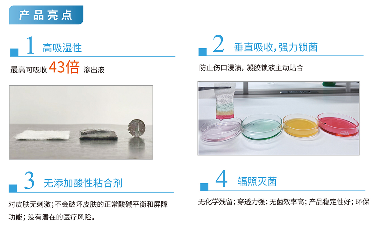 傷口愈合可視化、超強(qiáng)延展性、減少瘢痕形成、具有自溶性清創(chuàng)作用、防水透氣阻菌、預(yù)防靜脈炎、促進(jìn)傷口愈合