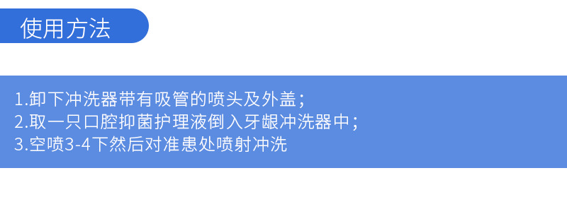 通過(guò)對(duì)口腔局部的沖洗,有助改善牙齦出血、腫痛、潰瘍、口腔異味、牙齒松動(dòng),促進(jìn)凝血和傷口愈合等。