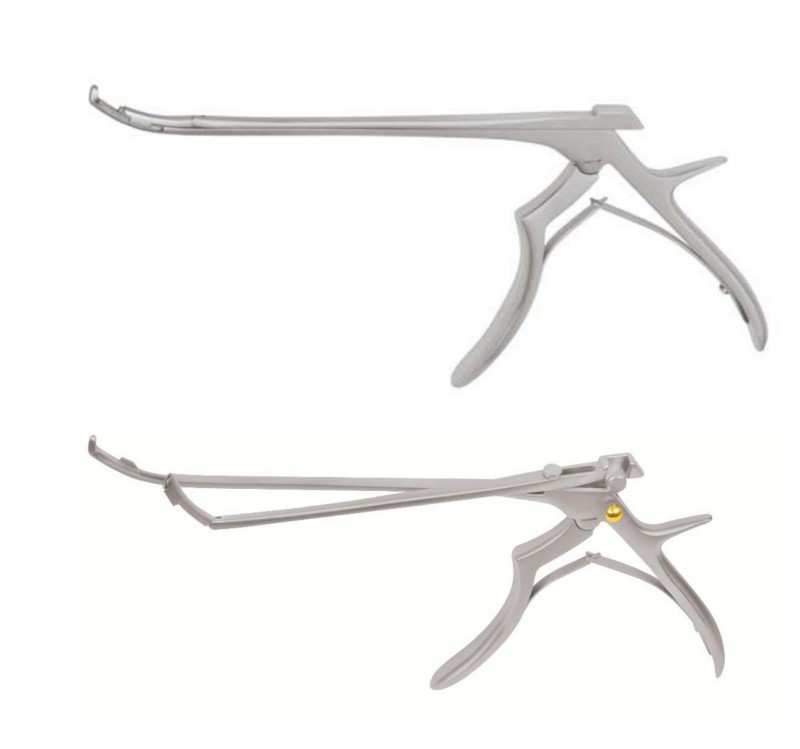 由鉗柄、鉗頭、彈簧片和鰓軸螺釘組成,型式可有單關(guān)節(jié)、雙關(guān)節(jié)、顱骨。其中單關(guān)節(jié)咬骨鉗鉗頭可分為直型和角(前)彎型,雙關(guān)節(jié)咬骨鉗鉗頭有直型、角(前)彎型和棘突型。頭部通常采用不銹鋼材料制成??芍貜?fù)使用。