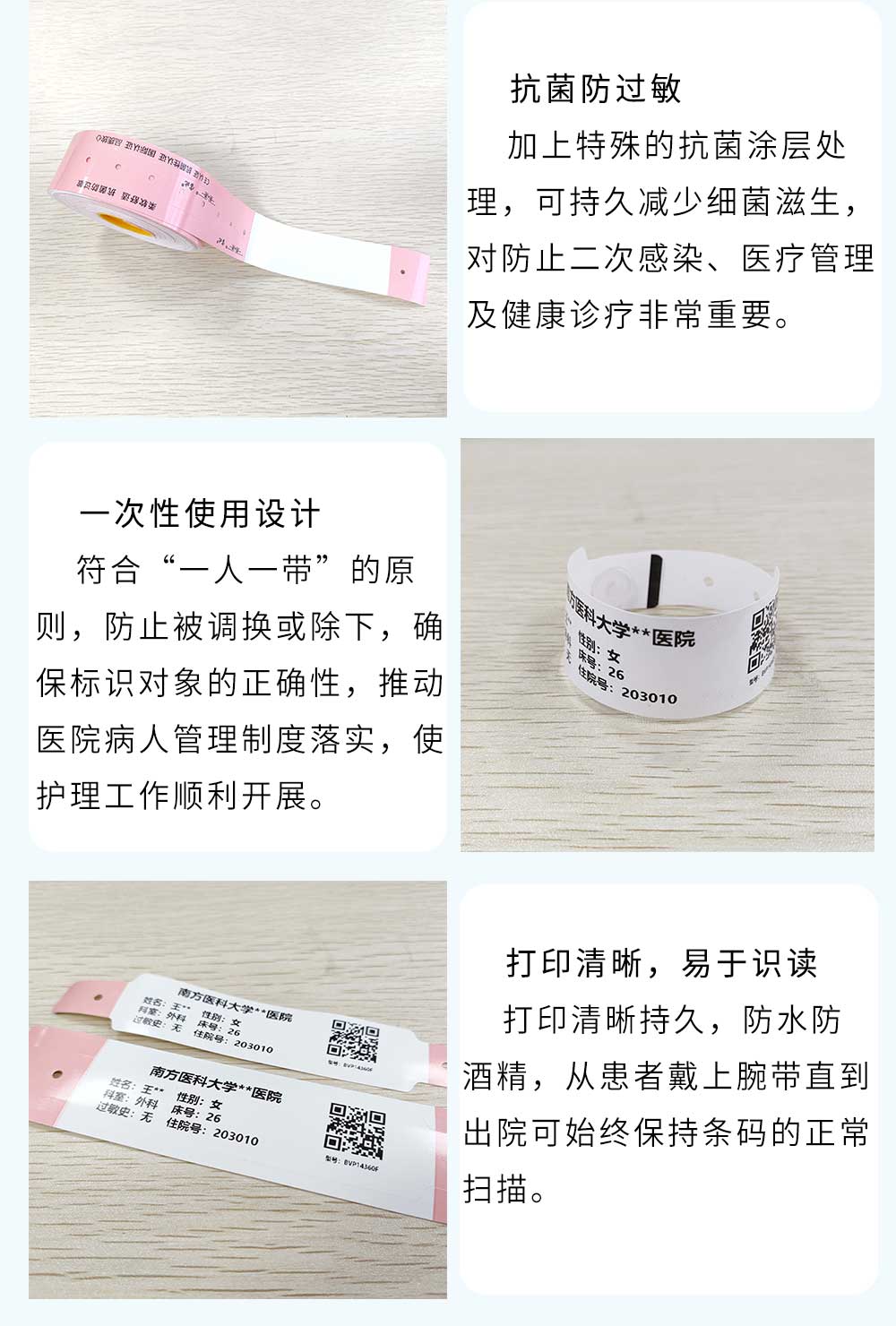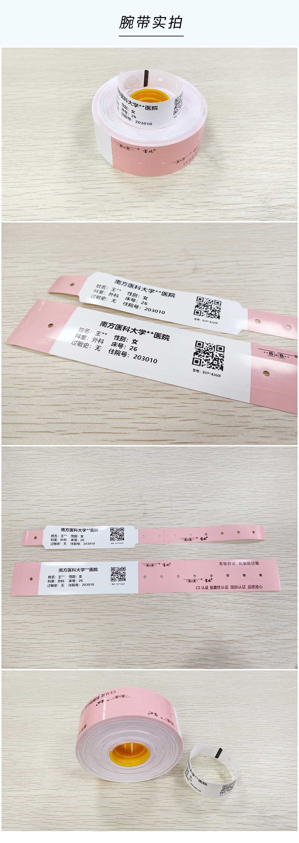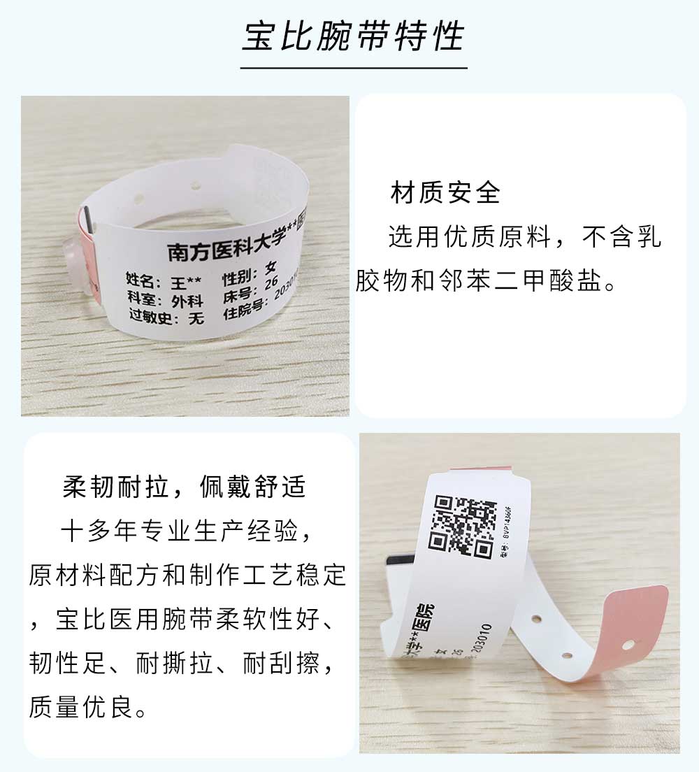 熱敏材質;一次性使用,不可轉移;防水防酒精,抗菌防過敏,國際認證,品質放心!可根據客戶需求自定義文字,一維碼,二維碼,圖片等打印內容,且能在數秒內通過寶比腕帶打印機BB777打印出來