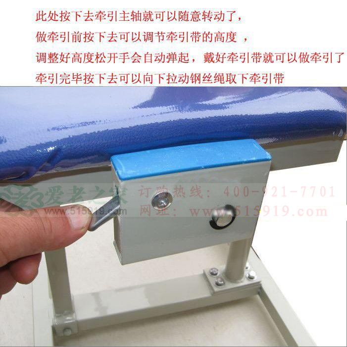2、使用時配合頸椎牽引帶,掛在牽引計數(shù)器上,轉(zhuǎn)動手輪。牽引力大小以使用者感覺適宜為好。