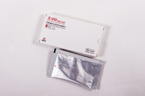 【使用方法】清潔創(chuàng)面后,將該敷料均勻的撒在創(chuàng)面上。用無(wú)菌紗布蓋好,再用繃帶包扎好或敷上無(wú)菌敷貼。3天后觀察一次,如無(wú)異常變化可重新包扎好,直至傷口痊愈,再?gòu)氐浊謇怼?
