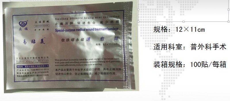 ?功能;本產(chǎn)品《釹鐵硼永磁速愈貼》主要用于外科手術(shù)切口的護(hù)理,具有止痛、消腫、促進(jìn)傷口愈合、防止粘膜粘連的作用。優(yōu)勢;替代傳統(tǒng)換藥,適用于手術(shù)室、普外科、骨科、腦外泌外科、婦產(chǎn)科等科室使用,產(chǎn)品除住院使用外醫(yī)生還可以開處方給患者帶回家自己使用,產(chǎn)品適應(yīng)科室廣泛、用量大空間大。