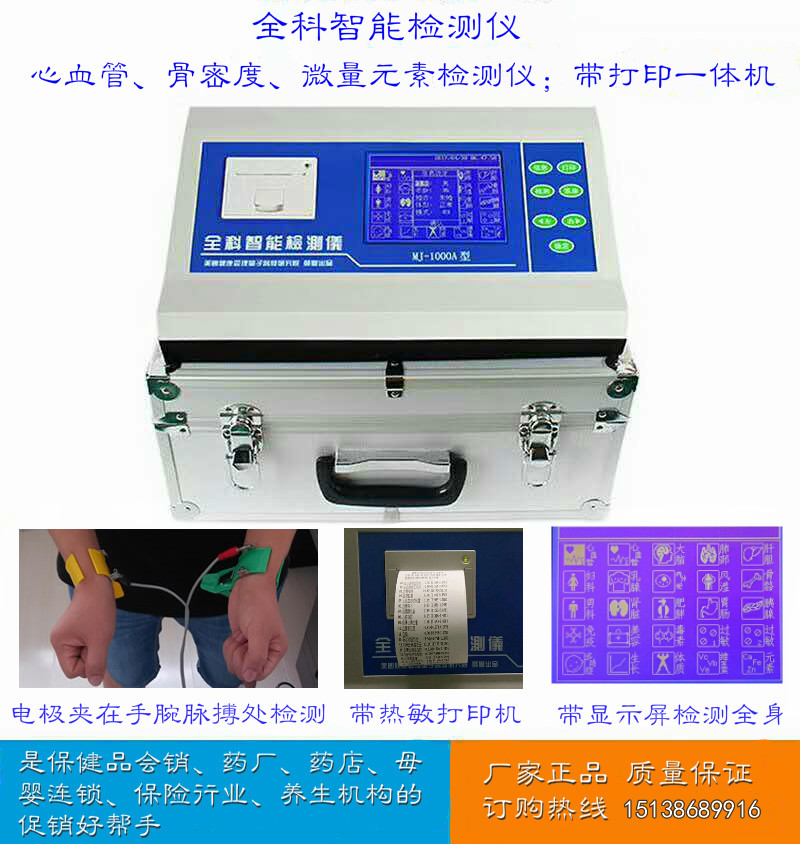 多功能全科檢測(cè)儀儀器功能:本儀器功能十分強(qiáng)大,可檢測(cè)項(xiàng)目包括:風(fēng)濕,骨病,心腦,鈣鐵鋅硒,骨密度,腦神經(jīng),婦科,肝膽,胃腸等等,包含了幾乎所有的藥品的主治方面。有強(qiáng)大的數(shù)據(jù)庫(kù)支持,可儲(chǔ)存數(shù)萬(wàn)份客戶資料,可快速翻查姓名電話聯(lián)系地址,進(jìn)行售后跟蹤。行業(yè)首創(chuàng)通過(guò)四路采集人體生物電波信號(hào),提高精準(zhǔn)率5%以上,全進(jìn)口主板及芯片組,增強(qiáng)設(shè)備穩(wěn)定性及兼容性,使可靠性有較高的提升。全方位綜合檢測(cè)系統(tǒng)? 1:?功能強(qiáng)大,支持檢測(cè)35種功能(并且不斷升級(jí)中) 2:?檢測(cè)快速準(zhǔn)確,一分鐘完成,讓你的營(yíng)銷時(shí)間不緊張 3:?分類檢測(cè),可出中醫(yī)檢測(cè)報(bào)告單西醫(yī)檢測(cè)報(bào)告單??? 4:?檢測(cè)報(bào)告單數(shù)據(jù)顯示,+ -號(hào)結(jié)果顯示 5:?打印快速方便,檢測(cè)完畢后點(diǎn)擊打印即可打印 6:?自動(dòng)儲(chǔ)存客戶病例,最多可儲(chǔ)存1萬(wàn)份 7:?無(wú)需培訓(xùn),操作簡(jiǎn)單 8:?檢測(cè)報(bào)告單數(shù)據(jù)顯示,數(shù)據(jù)簡(jiǎn)單易懂 9:?USB接口設(shè)置,無(wú)須接電源,攜帶快捷方便