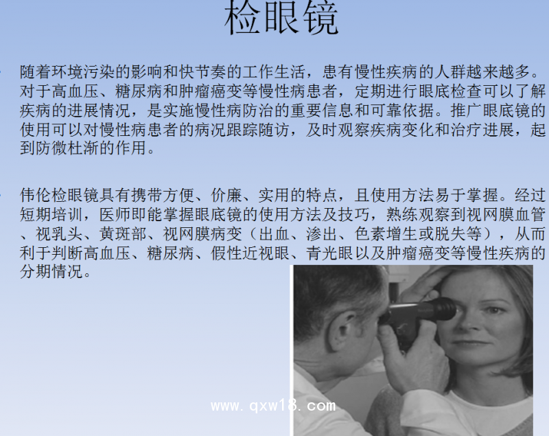 1、Welch是偉倫公司的創(chuàng)始人,也是世界上第一個(gè)發(fā)明眼底檢眼鏡的醫(yī)師。在同類(lèi)產(chǎn)品中,偉倫公司生產(chǎn)的檢眼鏡更具有權(quán)威性。