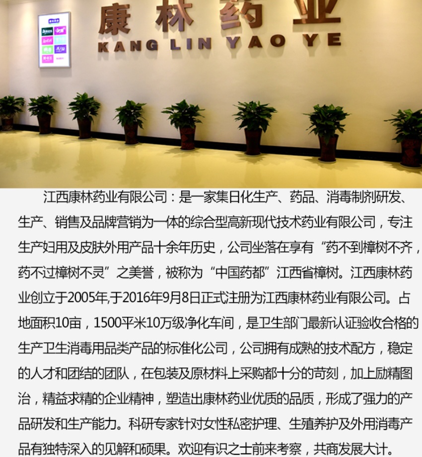 ? 江西康林藥業(yè)有限公司:是一家集日化生產(chǎn)、藥品、消毒制劑研發(fā)、生產(chǎn)、銷售及品牌營(yíng)銷為一體的綜合型高新現(xiàn)代技術(shù)藥業(yè)有限公司,專注生產(chǎn)婦用及皮膚外用產(chǎn)品十余年歷史,公司坐落被稱為“中國(guó)藥都”江西省樟樹(shù)市。占地面積10畝,1500平米10萬(wàn)級(jí)凈化車間,是衛(wèi)生部門最新認(rèn)證驗(yàn)收合格的生產(chǎn)衛(wèi)生消毒用品類產(chǎn)品的標(biāo)準(zhǔn)化公司;公司創(chuàng)立于2005年,于2016年9月8日正式注冊(cè)為江西康林藥業(yè)有限公司。公司資質(zhì)證件齊全,擁有成熟的技術(shù)配方,穩(wěn)定的人才和團(tuán)結(jié)的團(tuán)隊(duì),專業(yè)對(duì)外承接OEM貼牌生產(chǎn),歡迎來(lái)電洽談業(yè)務(wù);