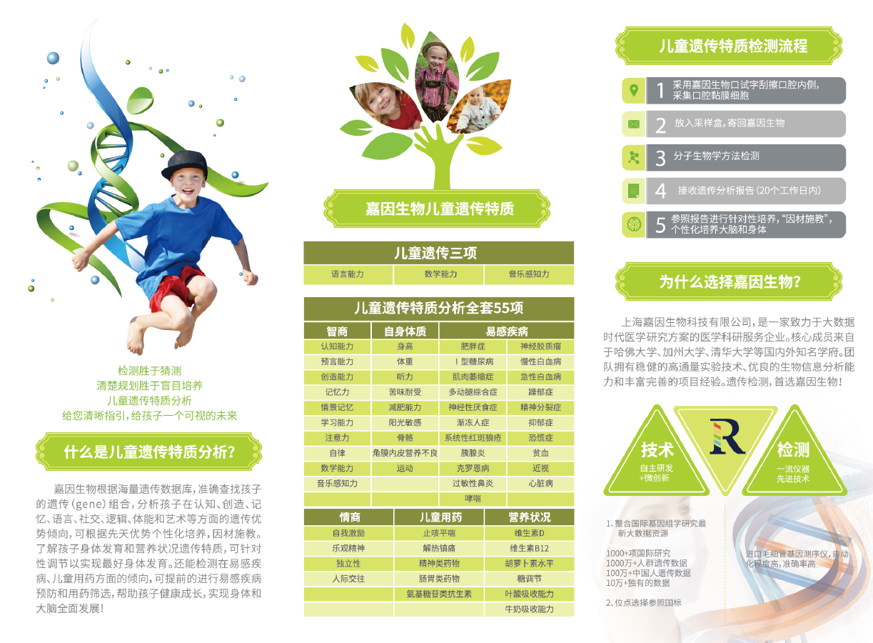 嘉因生物根據(jù)海量遺傳數(shù)據(jù)庫(kù),準(zhǔn)確查找孩子的遺傳組合,分析孩子在認(rèn)知、創(chuàng)造、記憶、語(yǔ)言、社交、邏輯、體能和藝術(shù)方面的遺傳優(yōu)勢(shì)傾向,可根據(jù)先天優(yōu)勢(shì)個(gè)性化培養(yǎng),因材施教。了解孩子身體發(fā)育和營(yíng)養(yǎng)狀況遺傳特質(zhì),可針對(duì)性調(diào)節(jié)以實(shí)現(xiàn)做好的身體發(fā)育。還能檢測(cè)在易感疾病、兒童用藥方面的傾向,可提前進(jìn)行易感疾病預(yù)防和用藥篩選,幫助孩子健康成長(zhǎng),實(shí)現(xiàn)身體和大腦的全面發(fā)展!