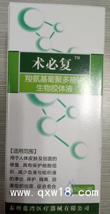 性能及組成:羧氨基葡聚多糖鈉生物膠體液由羧甲基殼聚糖和純化水組成;按裝量不同分為若干規(guī)格;pH值為5.0~6.5;氨基葡萄糖含量為345~575μg/ml;蛋白含量≤10μg/ml;重金屬含量≤10μg/ml;產(chǎn)品應(yīng)無菌。
