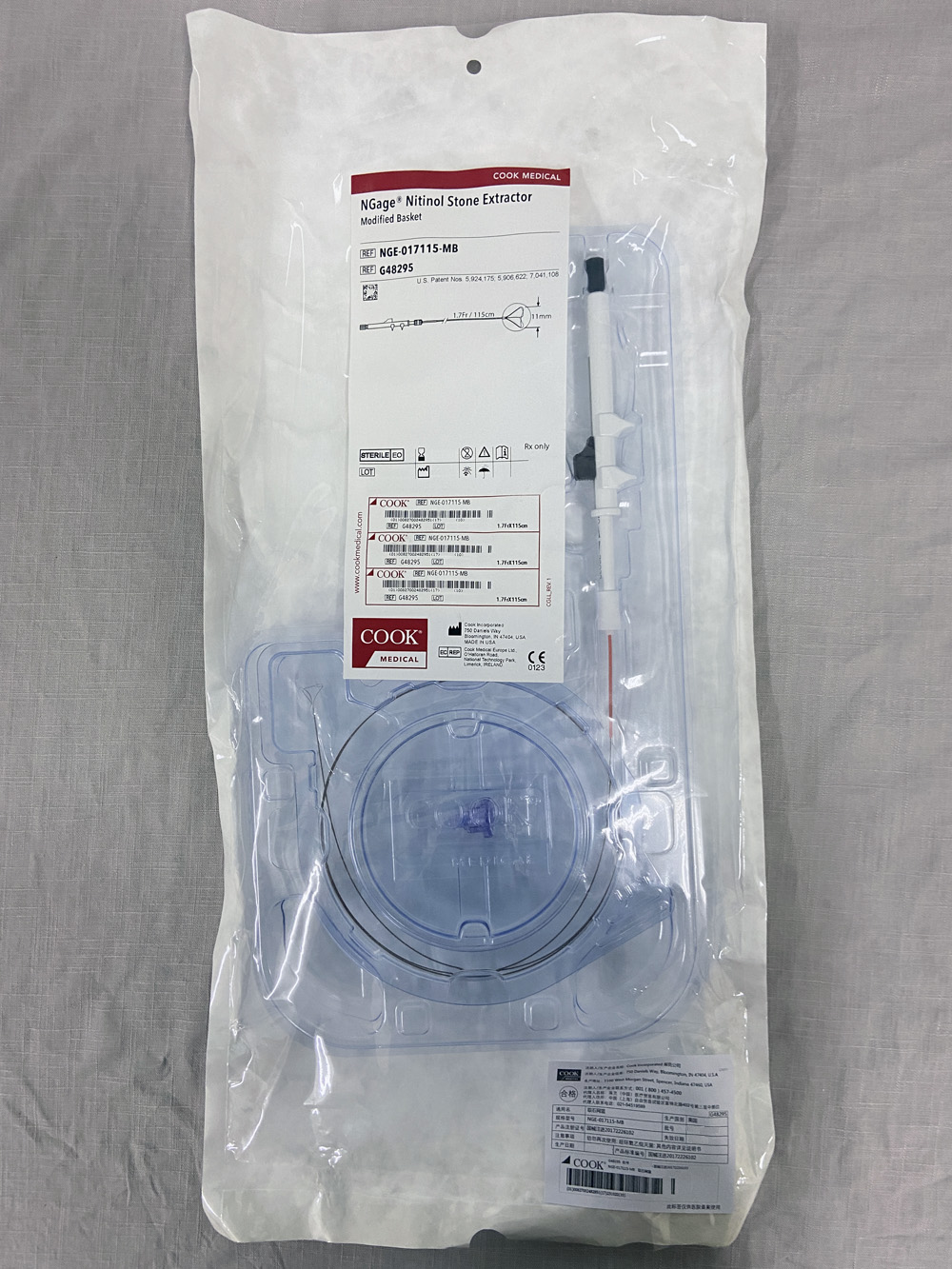 結(jié)構(gòu)及組成:Ngage取石網(wǎng)籃由網(wǎng)籃、網(wǎng)籃套管、鞘管、支持管、接頭、開關(guān)按鈕、手柄和夾頭組成。材料:網(wǎng)籃:鎳鈦合金;網(wǎng)籃套管:304不銹鋼;鞘管:聚四氟乙烯、304不銹鋼、聚酰亞胺和氟化乙丙烯;支持管:聚氯乙烯;接頭、開關(guān)按鈕和夾頭:乙縮醛;手柄:ABS;。產(chǎn)品經(jīng)環(huán)氧乙烷滅菌,一次性使用,貨架有效期三年。