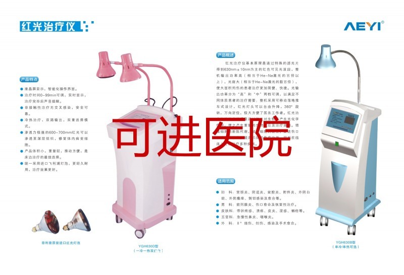 紅光治療儀是一種新型的可以應(yīng)用于醫(yī)院、家庭的光療設(shè)備,它基本原理是通過特殊燈芯得到630±10nm為主的紅色可見光波段,該波段對人體穿透深,療效更好。整機輸出功率高(相當(dāng)于He-Ne激光的百倍以上),光斑大(相當(dāng)于He-Ne激光的數(shù)百倍),為治療一些大面積的病癥提供的更好的治療方法光輸出分為“強”和“弱”檔以適應(yīng)不同體質(zhì)的患者;該儀器可以從“0”到“60”分鐘準(zhǔn)確設(shè)定治療時間;整機采用可移動落地推車式設(shè)計,紅光燈頭也可以平穩(wěn)升降,極大的方便了醫(yī)務(wù)工作者。