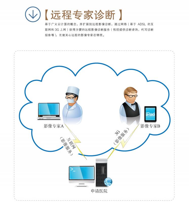 ???基層醫(yī)院數(shù)量不限,連接的檢查設(shè)備數(shù)量不限(須符合DICOM),可以隨時增加,需要遠(yuǎn)程診斷的數(shù)據(jù)通過設(shè)備或PACS發(fā)送至前置機(jī)工作站。