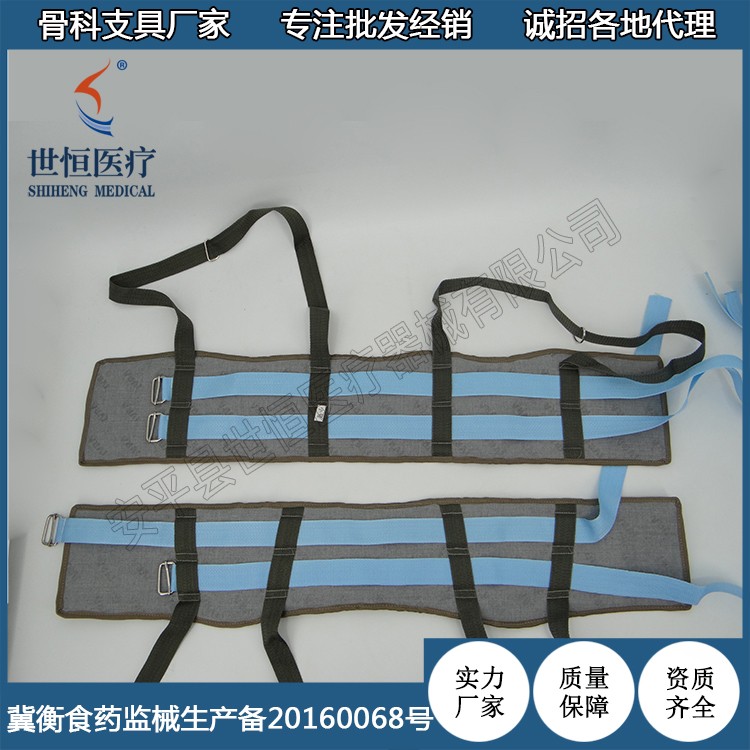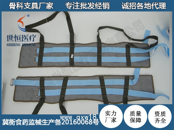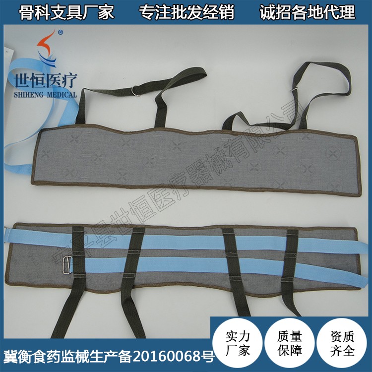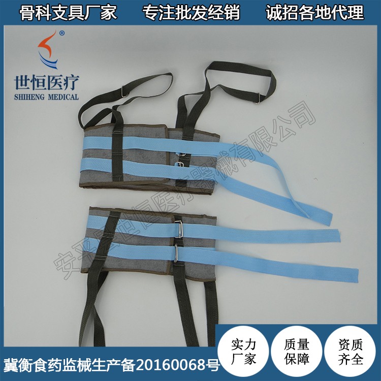 ? 由優(yōu)質(zhì)綠帆布、絨棉、織帶、活扣組成。鎖定盤骨,便于牽引。適合骨盆全形,貼身,舒適,壓力均勻,不需另加襯墊,便能避免皮膚損傷。
