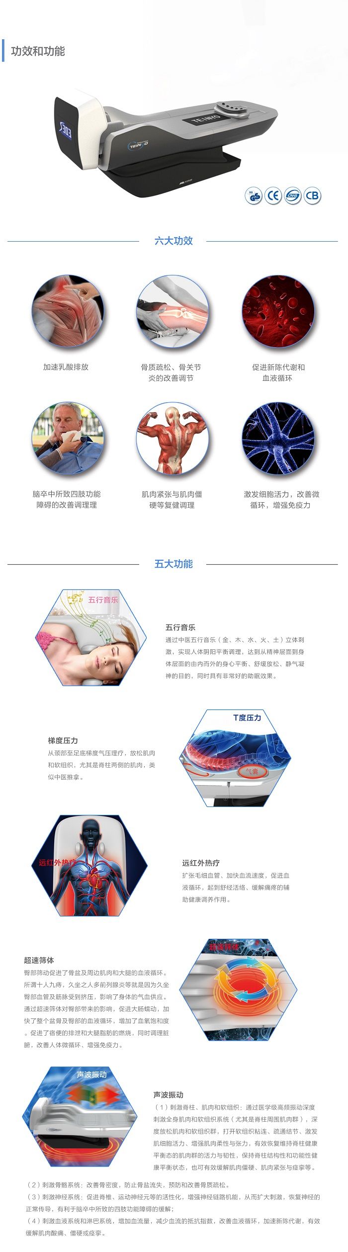 S303SP融合中醫(yī)五行音樂、橫向全聲波振動、縱向全聲波振動、遠紅外熱療、T度壓力等功能,主要用于運動所致堆積的乳酸排放和骨骼-肌肉的復健,還具有助眠、加速血流、促進新陳代謝、激發(fā)細胞活力、增強肌力、亞健康調理等...