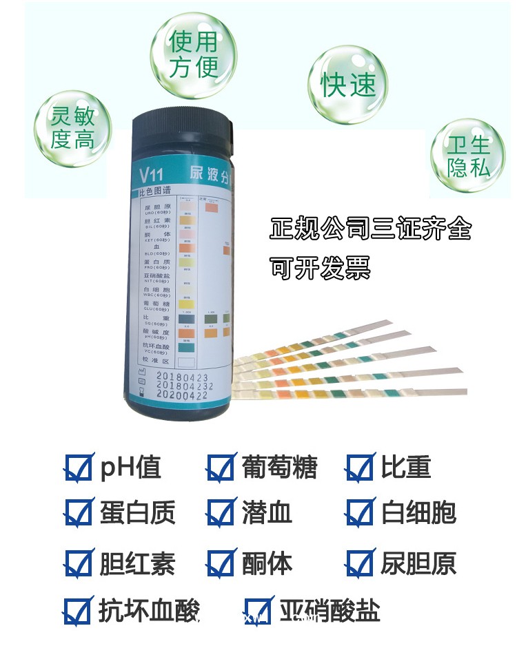 V11尿液分析試紙檢驗(yàn)項(xiàng)目:尿膽原、膽紅素、酮體、血、蛋白質(zhì)、亞硝酸鹽、白細(xì)胞、葡萄糖、比重、PH、抗壞血酸