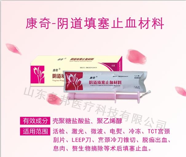 康奇?陰道填塞止血材料主要是由殼聚糖鹽酸鹽,聚乙烯醇和敷料成分組成。主要適用于宮頸活檢、激光、微波、冷凍、電熨、TCT宮頸刮片、LEEP刀、宮頸冷刀錐切、脫痂出血、息肉、贅生物摘除等術(shù)后填塞止血。