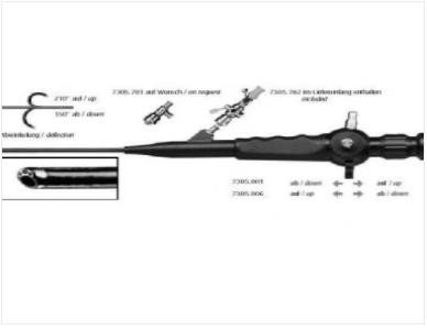 7331.001? ?3mm纖維輸尿管腎鏡 上彎130° 下彎160° 器械通道4Fr.? 工作長(zhǎng)度600mm 包括: 829.601 ??活檢鉗 163.903?? 測(cè)漏器 163.904?? 氣閥 7321.911? 清潔刷