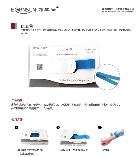 用于醫(yī)療機構在常規(guī)靜脈輸液、抽血、輸血時,扎緊手臂,促進靜脈血管充盈,便于靜脈穿刺的實施,同時暫時阻斷靜脈回流